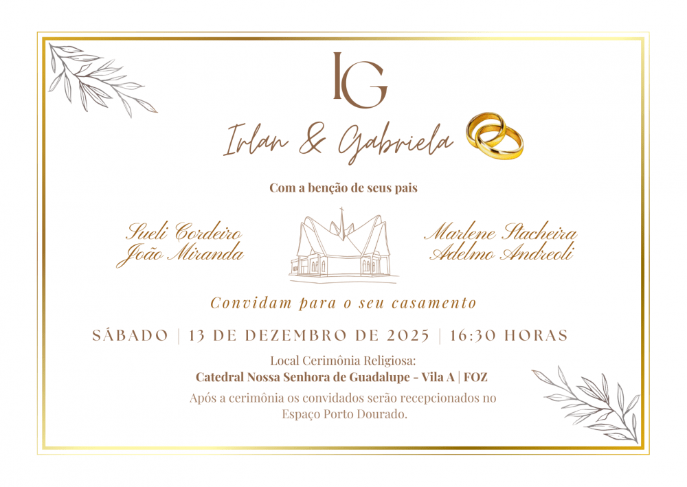 A cerimônia acontecerá às 16:30, na Catedral Nossa Senhora de Guadalupe - vila A. Após a missa, seguiremos para a recepção no Porto Dourado, que fica próximo ao ICLI, onde vamos comemorar juntos esse momento tão esperado.
